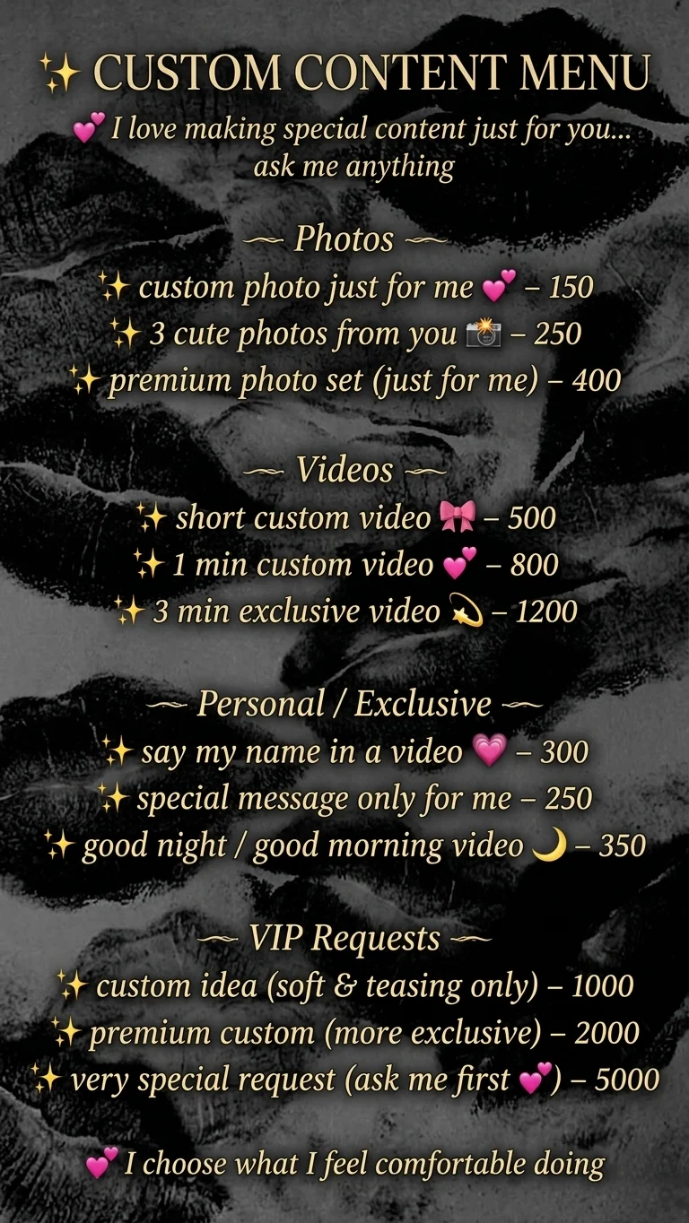 烹饪, 紧身内衣, Cosplay, 假阳具或震动器, 色情舞, 恋足, 高跟鞋, 乳胶, 皮革, 按摩, 精油表演, 情境扮演, 抽烟, 电臀舞, 狗式, 骑脸, 足交, 打飞机, 羞辱, 手淫指导, 情妇, 丝袜, 脱衣舞, 裙底风光, 瑜伽, 大屌评分, 高潮, 鞭打